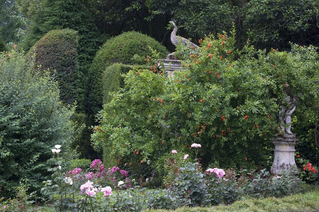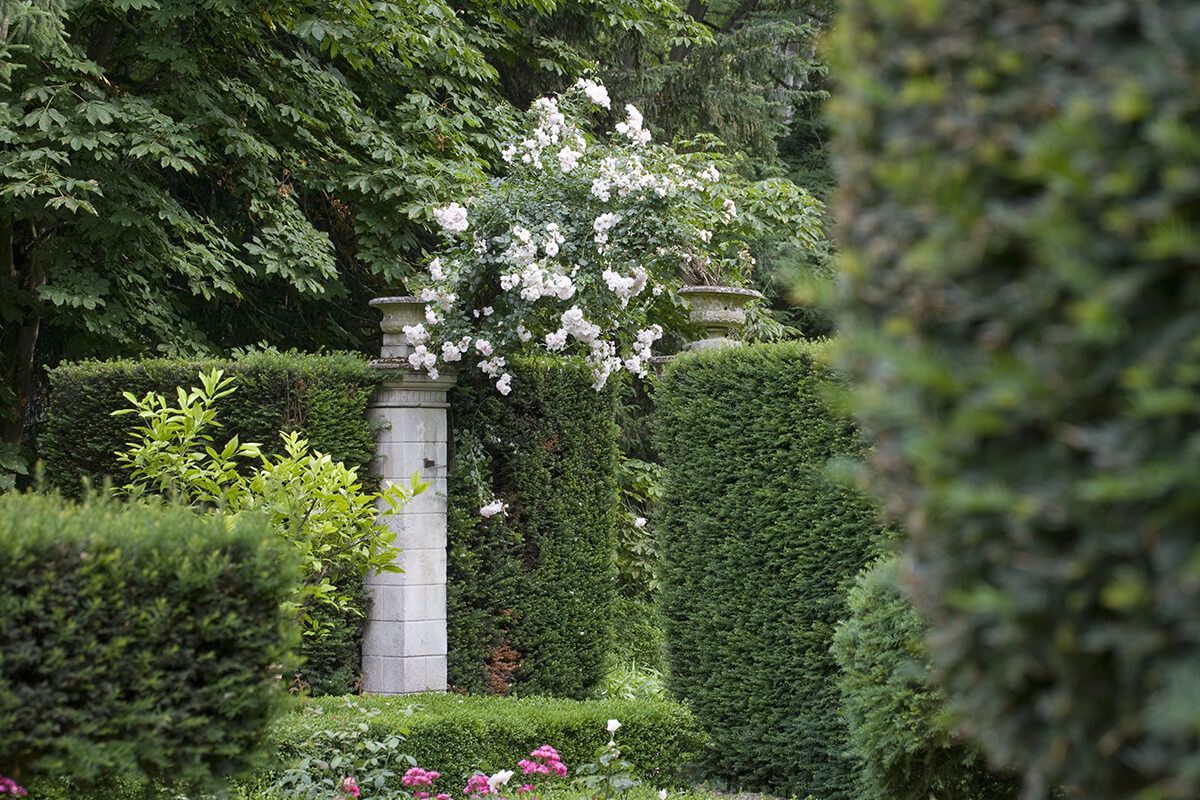 Siepe di tassi topiati in forma di solidi divide “l’immediate garden” dalla prateria e dal parco che è percorso da un viale perimetrale con diramazioni lungo le quali si incontrano in successione: la ghiacciaia naturale, la fontana dedicata alla Symonds, il giardino roccioso (la Mockery), le false rovine (“Tempio di Baal e mura di Gerico”), la Cappella di Famiglia, importante ed unico esempio di stile neogotico elisabettiano realizzata nel 1860 dallo scultore Antonio Gradenigo (scultore per Jappelli nel Caffè Pedrocchi a Padova) su progetto di Pietro Selvatico Estense, il Teatro dell’800 e il Tempietto dedicato a Sant’Antonio. Ma il capolavoro di questo splendido progetto è la grande quantità e varietà di piante secolari e monumentali, anche non autoctone, le cui dimensioni e chiome fanno di ciascuno un esemplare, unico oltre che storico.